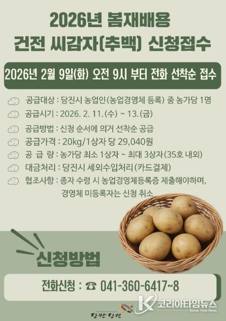 코리아타임뉴스 김택호 기자 | 당진시는 봄 재배용으로 활용될 조직배양 ‘추백’ 씨감자 원종 2톤을 관내 농가에 공급하기 위해 오는 9일 오전 9시부터 선착순으로 신청을 받는다고 3일 밝혔다.