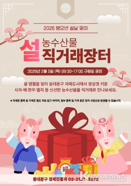 코리아타임뉴스 오영주 기자 | 동대문구가 5일 오전 9시 30분부터 오후 5시까지 구청 앞 미래광장에서 설 농수산물 직거래 장터를 연다.