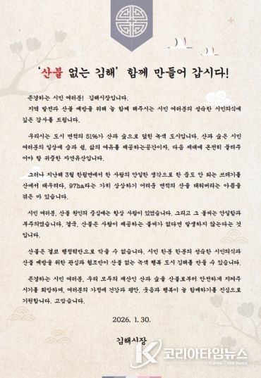 코리아타임뉴스 오영주 기자 | 김해시는 건조한 날씨에 산불 발생 위험이 증가하고 있어 시민들의 적극적인 협조를 당부하는 시장 서한문을 사회단체와 산불취약지역 주민에게 발송했다고 3일 밝혔다.