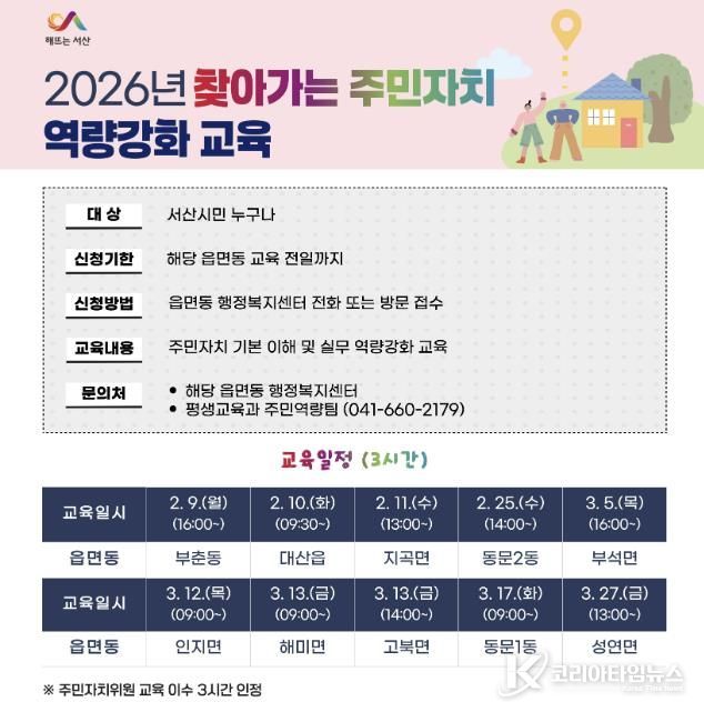 코리아타임뉴스 김택호 기자 | 충남 서산시는 2월 9일부터 3월 27일까지 관내 10개 읍면동을 대상으로 ‘2026년 찾아가는 주민자치 역량 강화교육’을 운영한다고 밝혔다.