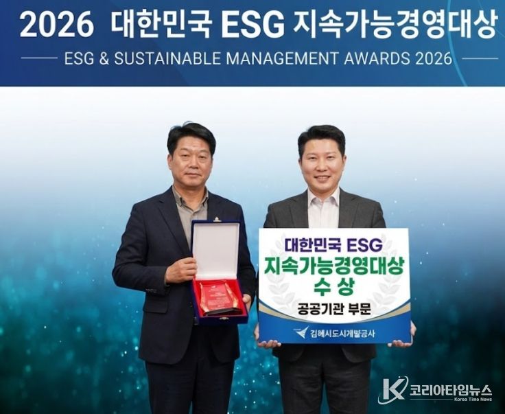 코리아타임뉴스 오영주 기자 | 김해시도시개발공사가 지난 4일 일산 킨텍스에서 열린 ‘2026 대한민국 ESG 지속가능경영대상’ 시상식에서 공공기관 부문 ‘대상’을 수상했다.