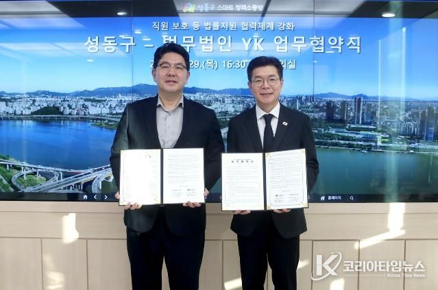 코리아타임뉴스 오영주 기자 | 서울 성동구는 지난 1월 29일 직원 보호 등 법률 지원 협력체계 강화를 위해 법무법인 YK와 업무협약을 체결했다고 밝혔다.