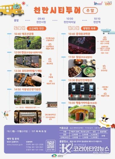 코리아타임뉴스 김택호 기자 | 천안시가 3월부터 11월까지 ‘2026년 천안시티투어’를 본격적으로 운영한다고 9일 밝혔다.