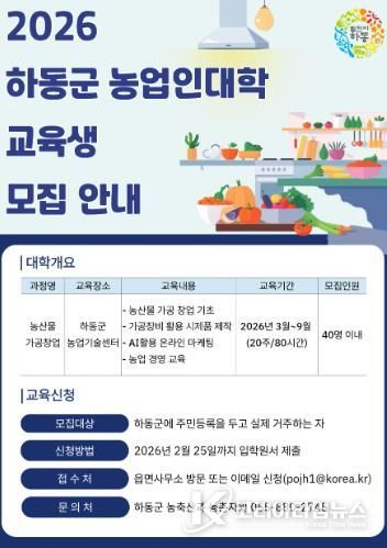 코리아타임뉴스 오영주 기자 | 하동군은 농산물 가공 및 창업을 희망하는 군민을 대상으로 전문 인력을 육성하기 위해 ‘2026년 하동군농업인대학’ 교육생을 오는 2월 25일까지 모집한다고 밝혔다.