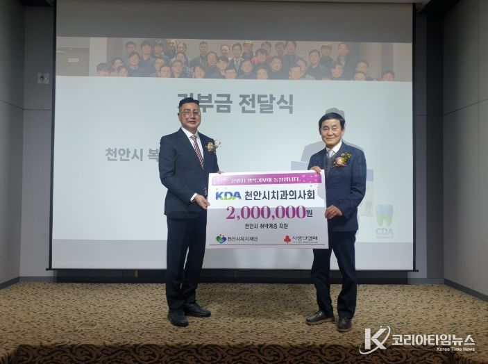 코리아타임뉴스 김택호 기자 | (재)천안시복지재단은 천안시치과의사회가 지난 6일 열린 정기총회에서 취약계층을 위한 후원금 200만 원을 기탁했다고 밝혔다.