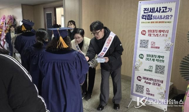 합동 홍보반은 졸업생들에게 전세계약 전․후 유의사항과 안심전세 앱 QR 코드가 담긴 홍보 책자를 배부하며 ▲유형별 전세사기 사례 ▲안심전세 앱 활용법 ▲전세계약 체크리스트 등을 안내했다. 안심전세 앱을 통해 주요 시세정보, 악성 임대인 여부, 공인중개사의 경력 등 전세 계약 시 필수로 확인해야 하는 주요 정보들을 한눈에 확인 할 수 있다.