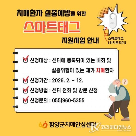 코리아타임뉴스 오영주 기자 | 함양군치매안심센터는 치매 환자의 실종을 예방하고 위급 상황 발생 시 신속한 발견을 돕기 위해 위치 확인을 할 수 있는 ‘스마트 태그’를 무상으로 지원한다고 밝혔다.