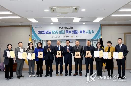 코리아타임뉴스 노승선 기자 | 전라남도의회는 2월 9일 도의회 4층 회의실에서 2025년도 ESG 실천 우수 의원·부서 시상식을 개최했다.