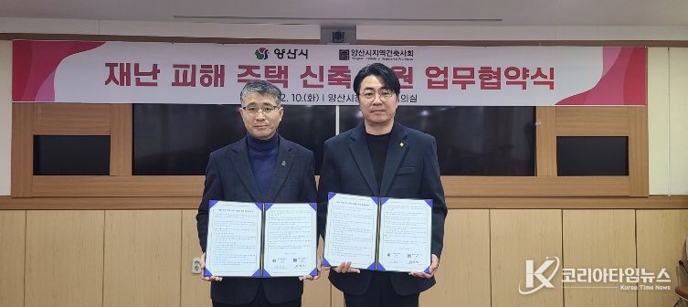 코리아타임뉴스 오영주 기자 | 양산시는 지난 10일 시청 소회의실에서 양산시지역건축사회와 함께 '재난피해주택 신축 지원을 위한 업무협약'을 체결했다.