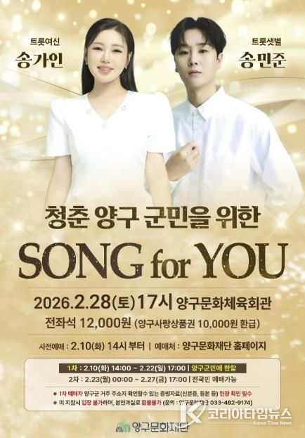 코리아타임뉴스 이아름 기자 | 양구문화재단은 다가오는 봄을 맞아 양구군민의 문화 향유 기회를 확대하고 지역에 활력을 불어넣기 위해 2월 기획 콘서트 ‘SONG FOR YOU’양구군민 콘서트를 개최한다.