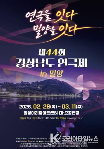 코리아타임뉴스 오영주 기자 | 밀양시는 경남 연극인들의 최대 축제이자 경연대회인 ‘제44회 경상남도 연극제’가 오는 2월 26일부터 3월 11일까지 14일간 밀양아리랑아트센터에서 개최된다고 밝혔다.