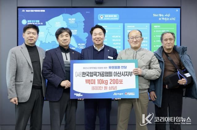 코리아타임뉴스 김택호 기자 | 한국양곡가공협회 아산시지부는 지난 12일 아산시청을 방문해 취약계층 지원을 위한 600만 원 상당의 쌀 10kg 200포를 전달했다.