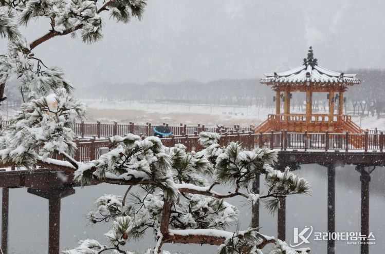 코리아타임뉴스 박찬식 기자 | 대설주의보가 내린 24일 하얀 눈이 소복이 내려앉은 충북 괴산군 동진천 옆 소나무길이 겨울 정취를 물씬 풍기고 있다.