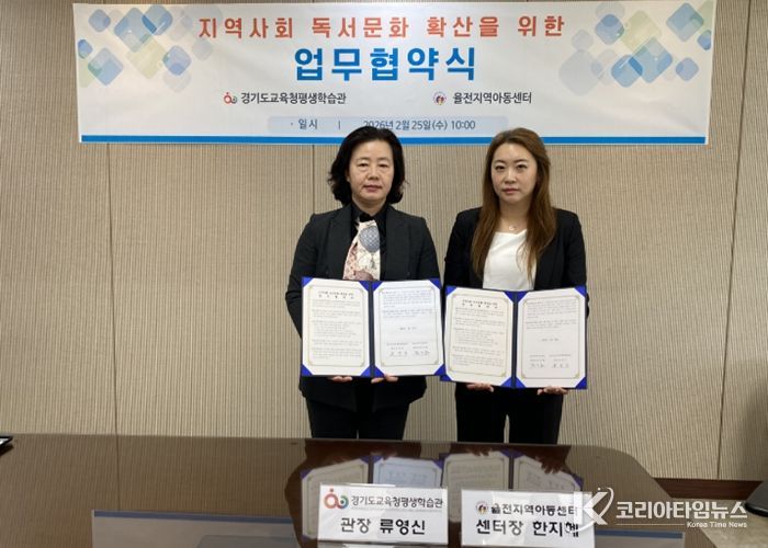 코리아타임뉴스 사회팀 | 경기도교육청평생학습관이 25일 지역사회 어린이들의 독서문화 확산과 다양한 독서프로그램 개발을 위해 율전지역아동센터(센터장 한지혜)와 업무협약을 체결했다.