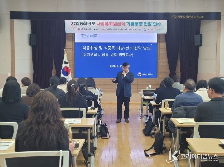 코리아타임뉴스 사회팀 | 경북교육청은 25일 의성군에 있는 경상북도교육청 의성도서관 시청각실에서 도내 교육지원청 유치원 급식 담당자와 순회 영양교사 등 40여 명을 대상으로 ‘2026학년도 사립유치원 급식 기본 방향 전달 연수’를 개최했다고 밝혔다.