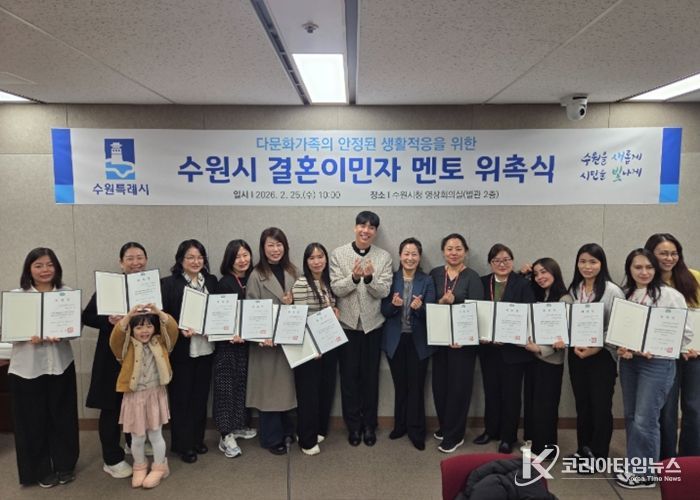 코리아타임뉴스 사회팀 | 수원특례시가 25일 시청 영상회의실에서 ‘2026년 결혼이민자 멘토 위촉식’을 열고 선배 이민자 멘토 15명을 위촉했다.