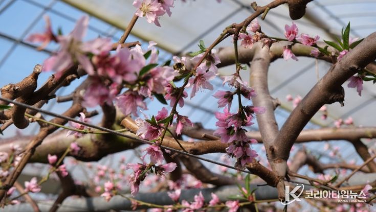 코리아타임뉴스 박찬식 기자 | 충북 영동군 시설하우스 내에 겨울 한파를 이겨내고 피어난 복사꽃과 플럼코트 꽃이 만발했다.