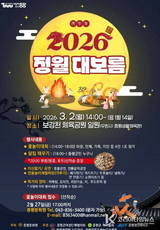 코리아타임뉴스 박찬식 기자 | 충북 증평군이 오는 3월 2일 오후 2시, 보강천 체육공원 일원에서 정월대보름 행사를 개최한다고 26일 밝혔다.
