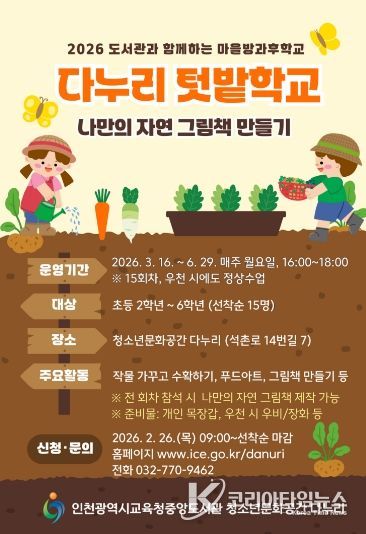 코리아타임뉴스 사회팀 | 인천광역시교육청중앙도서관 청소년문화공간 다누리는 26일부터‘다누리 텃밭학교: 씨앗에서 그림책까지’ 참여자를 모집한다.