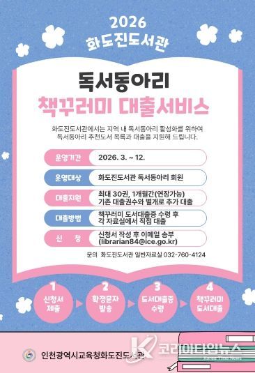 코리아타임뉴스 사회팀 | 인천광역시교육청화도진도서관은 토론 중심 독서문화 확산을 도모하기 위하여, 오는 3월 3일부터 ‘독서동아리 책꾸러미 대출서비스’를 운영한다.
