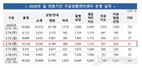 코리아타임뉴스 김태훈 기자 | 소방청은 2026년 설 연휴 기간(2.14.~2.18., 5일간)전국 총 45,082건의 구급 출동으로 24,166명을 이송하였으며, 구급상황관리센터에서 총 42,062건의 상담을 실시했다고 밝혔다.