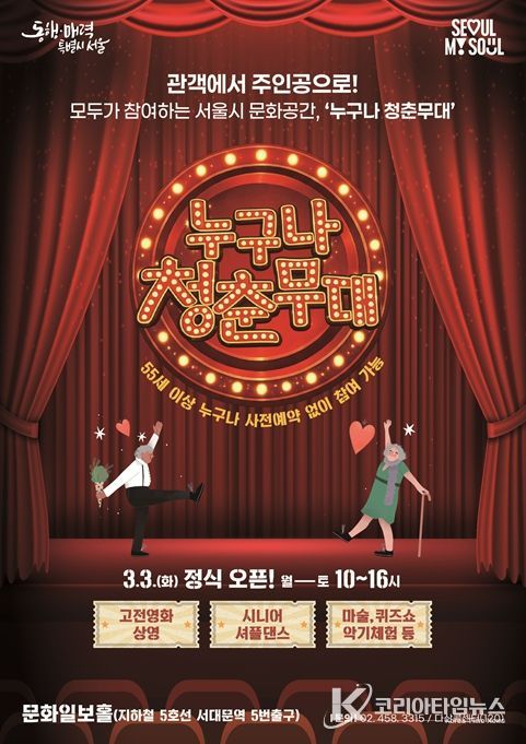 코리아타임뉴스 윤경수 기자 | 서울시는 어르신들이 편하고 즐겁게 머물 수 있는 문화쉼터 ‘누구나 청춘무대’를 3일부터 정식 운영한다고 밝혔다. ‘누구나 청춘무대’는 55세 이상 어르신이면 누구나 무료로 공연과 영화를 관람하고 다양한 체험 프로그램에 참여할 수 있는 열린 문화공간이다.