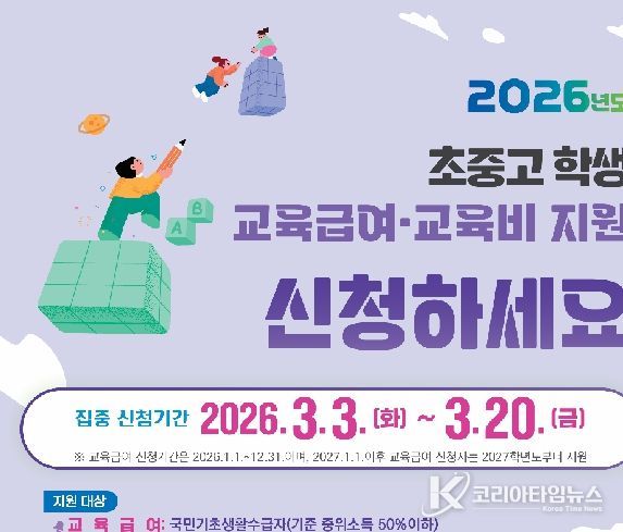 코리아타임뉴스 사회팀 | 대전시교육청과 동·서부교육지원청은 3월 3일부터 3월 20일까지 저소득층 가정을 대상으로 ‘2026학년도 초·중·고 학생 교육급여 및 교육비 집중 신청 기간’을 운영한다고 밝혔다.