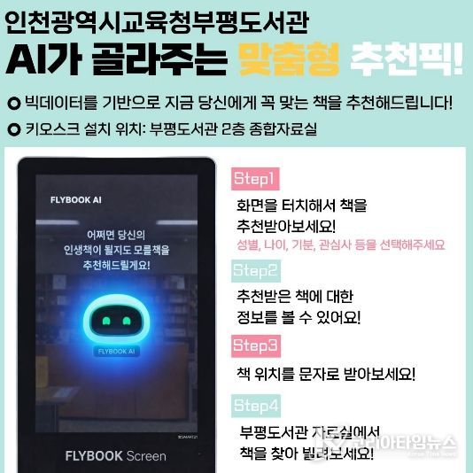 코리아타임뉴스 사회팀 | 인천광역시교육청부평도서관은 빅데이터와 인공지능(AI)을 활용한 개인 맞춤형 도서 추천 서비스인 ‘플라이북 키오스크’를 운영한다고 3일 밝혔다.