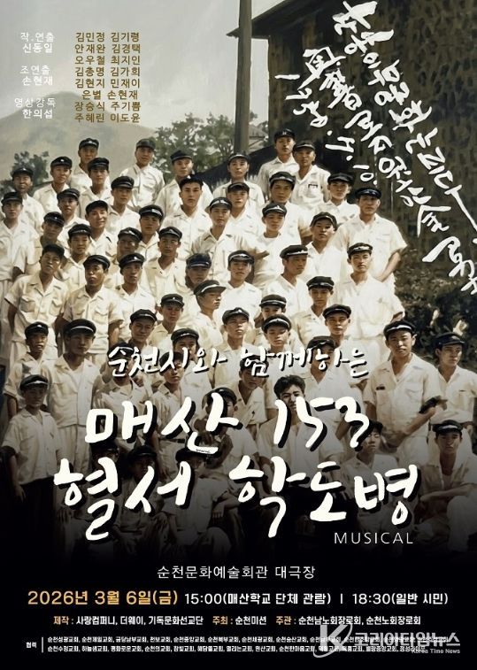 코리아타임뉴스 전남취재본부 | 순천시는 6.25전쟁 당시 나라를 지키기 위해 펜 대신 총을 들고 전쟁에 나섰던 지역 학도병들의 숭고한 희생을 기리는 창작 뮤지컬 공연이 오는 6일 오후 6시 30분 순천문화예술회관 대극장에서 열린다고 밝혔다.