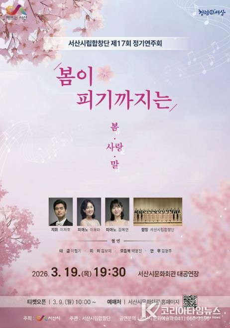 코리아타임뉴스 김택호 기자 | 충남 서산시는 오는 3월 19일 오후 7시 30분 문화회관 대공연장에서 서산시립합창단 제17회 정기연주회 ‘봄이 피기까지는’이 개최된다고 밝혔다.