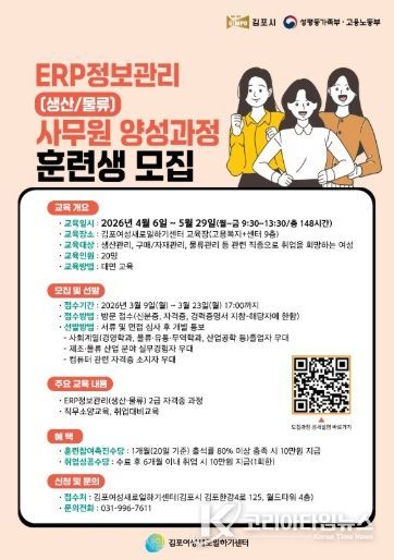 코리아타임뉴스 기동취재팀 | 김포여성새로일하기센터는 지역 산업 수요에 부합하는 전문 인력 양성과 경력보유 여성의 안정적인 취업 지원을 위해 '전사적 자원관리(ERP) 생산·물류 사무원 양성 과정' 훈련생을 모집한다.