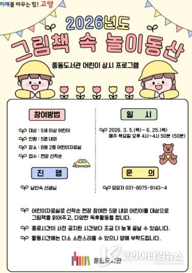 코리아타임뉴스 문화팀 | 고양특례시 풍동도서관은 어린이 그림책 읽어주기 상시 프로그램 ‘그림책 속 놀이동산’을 운영한다고 5일 밝혔다.