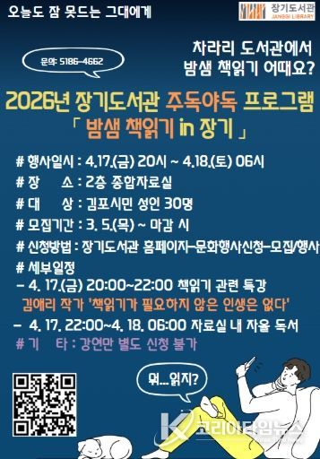 코리아타임뉴스 문화팀 | 김포시 장기도서관은 시민들이 책과 함께 특별한 밤을 보낼 수 있도록 오는 4월 17일 오후 8시부터 다음날인 4월 18일 오전 6시까지 도서관에서 자율적으로 독서를 하는 '밤샘 책읽기 인(in) 장기' 프로그램을 진행한다.
