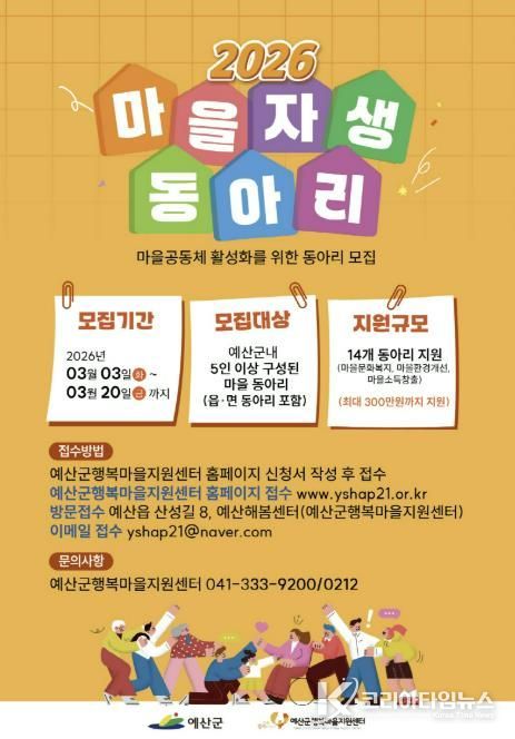 코리아타임뉴스 김택호 기자 | 예산군행복마을지원센터는 마을에 활력을 불어넣고 마을공동체 회복을 도모하기 위해 2026년 마을자생동아리를 3월 20일까지 모집한다고 밝혔다.
