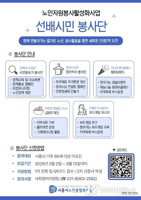 봉사단 인원은 총 10명을 선정할 계획으로, 모집 기간은 3월 13일까지다. 신청은 시흥시노인종합복지관 사회참여지원팀으로 전화하거나 홍보 포스터의 정보무늬(큐알코드)를 통해 하면 된다.