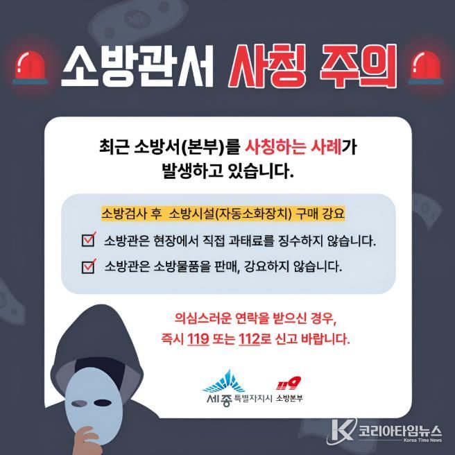 코리아타임뉴스 세종취재분부 | 최근 세종소방본부를 사칭해 소방용품 구매를 강요하는 사기 시도가 잇따르고 있어 시민들의 각별한 주의가 요구된다.