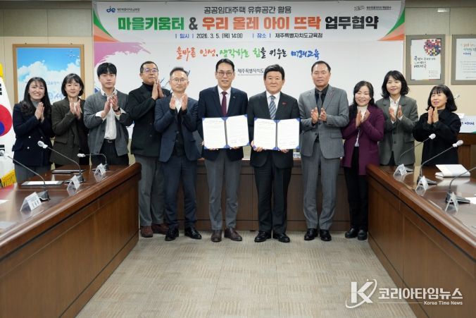 코리아타임뉴스 사회팀 | 제주특별자치도교육청은 제주특별자치도개발공사와 5일 도교육청 상황실에서 공공임대주택 유휴공간을 활용한 ‘우리 올레 아이 뜨락’ 사업과 도교육청 ‘2026 마을키움터 운영’ 사업의 상호 협력을 위한 업무협약을 체결했다.