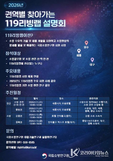 코리아타임뉴스 김태훈 기자 | 소방청이 국립소방연구원이 소방 기술과 제품이 실제 재난 현장에 효과적으로 적용될 수 있도록 지원하는 ‘119리빙랩(Living Lab) 사업 설명회’를 3월 11일부터 13일까지 3일간 총 네 차례에 걸쳐 개최한다고 밝혔다.
