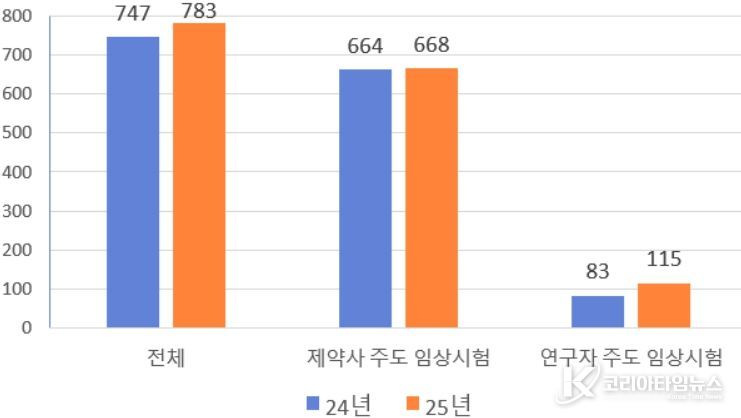 코리아타임뉴스 의료보건팀 | 식품의약품안전처는 2025년 의약품 임상시험 승인 현황을 분석한 결과 전년 대비 4.8% 상승한 전체 783건의 임상시험이 승인된 것으로 확인됐다.