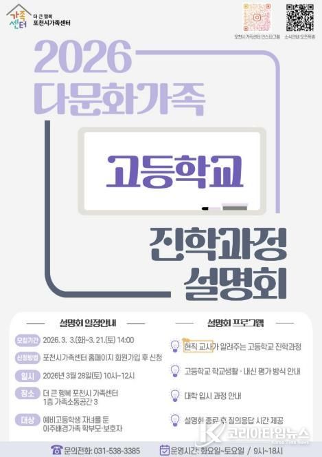 코리아타임뉴스 윤광희 기자 | 포천시 직영 더 큰 행복 포천시가족센터가 오는 28일, '2026 다문화가족 고등학교 진학과정 설명회'를 개최한다.