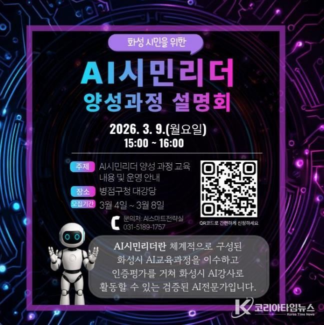 코리아타임뉴스 사회팀 | 화성특례시는 시민이 학습하고 교육하는 인공지능(AI) 학습 체계 구축을 위해 ‘2026년 AI시민리더 양성 교육’ 설명회를 3월 9일 오후 3시에 병점구청 대강당에서 개최한다.