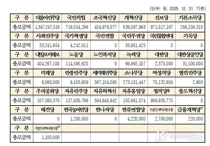 코리아타임뉴스 김택호 기자 | 중앙선거관리위원회는 2025년도 중앙당후원회와 국회의원후원회의 후원금 모금내역을 집계한 결과, 37개의 중앙당(중앙당창당준비위원회 포함)후원회가 총 81억 7천8백여만 원을, 303개의 국회의원후원회가 총 608억 3천2백여만 원을 모금했다고 밝혔다.