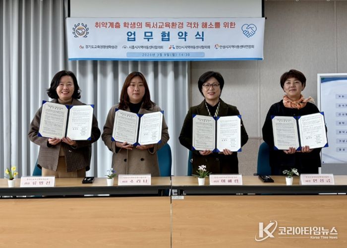 코리아타임뉴스 사회팀 | 경기도교육청평생학습관이 취약계층 학생의 기초학력 향상 및 미래역량 강화를 위해 시흥시지역아동센터협의회, 안산시지역아동센터협의회, 안성시지역아동센터연합회와의 업무협약을 체결했다.