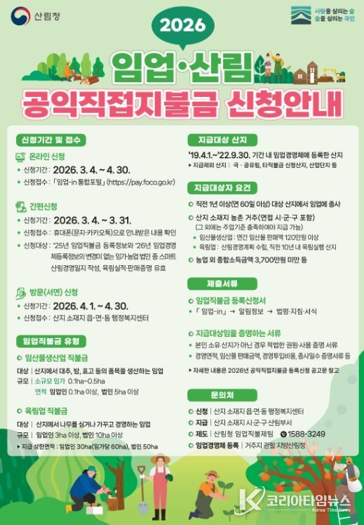 코리아타임뉴스 노승선 기자 | 고흥군은 임업·산림의 공익기능을 증진하고 임업인의 소득 안정을 지원하기 위해 ‘2026년도 임업·산림 공익직접지불금(임업직불금)’ 등록 신청을 4월 30일까지 접수한다고 밝혔다.