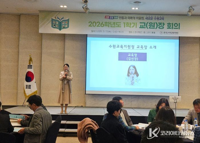 코리아타임뉴스 사회팀 | 경기도수원교육지원청은 3월 10일 화성 푸르미르 1층 그랜드볼룸홀에서 관내 유·초·중·고·특 교(원)장과 수원교육지원청 직원(총 274명 참석)을 대상으로 한 '2026학년도 1학기 교(원)장 회의'를 개최하여 2026학년도 교육과정 운영 방향과 학교 현장의 주요 현안을 공유하고 협력 방안을 모색했다.