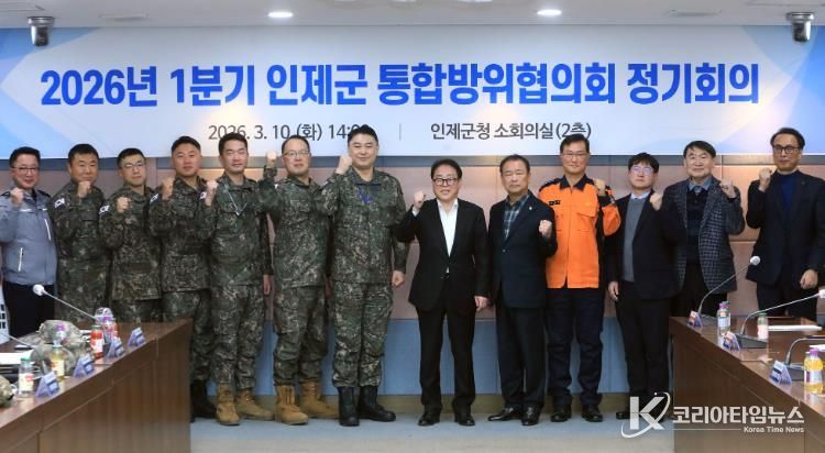 코리아타임뉴스 이아름 기자 | 인제군은 10일 인제군청 소회의실에서 ‘2026년 1분기 인제군 통합방위협의회 정기회의’를 개최하고 지역 안보 현안을 점검하며 통합방위 대응 체계 강화 방안을 논의했다.