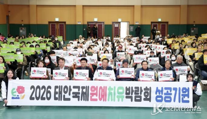 코리아타임뉴스 김택호 기자 | 태안군이 범군민지원협의회와 함께 ‘2026년 태안국제원예치유박람회’의 성공적인 개최를 위해 지역 주민들의 자발적인 참여를 이끌어내는 대규모 범군민 다짐대회를 개최하며 민관 협력 기반의 강력한 흥행몰이에 나선다.