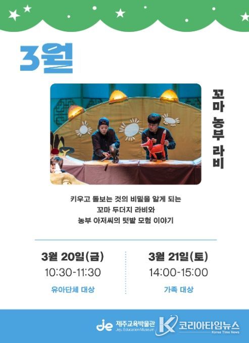 3월 공연 신청은 13일부터 18일까지 제주특별자치도교육청 통합예약시스템을 통해 선착순으로 접수하며 자세한 내용은 제주교육박물관 누리집에서 확인할 수 있다.