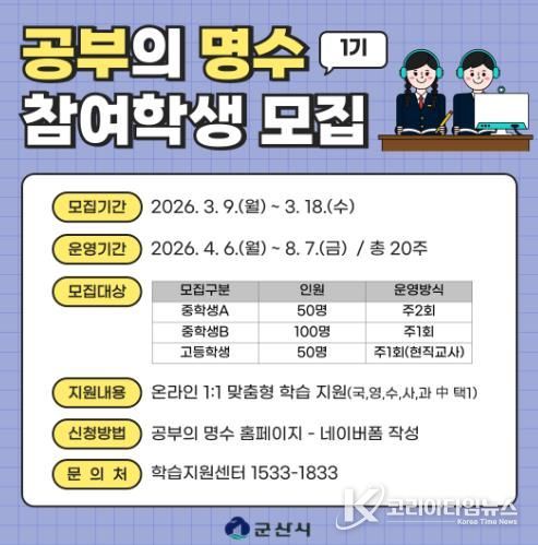 코리아타임뉴스 김태훈 기자 | 군산시는 교육격차 해소와 학생 맞춤형 학습 지원을 위해 ‘공부의 명수’ 온라인 튜터링 1기 참여 학생을 모집한다고 밝혔다.