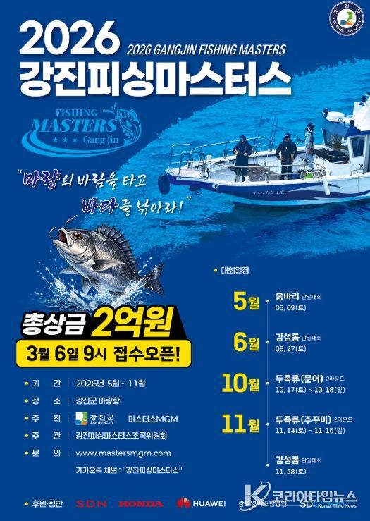 코리아타임뉴스 노승선 기자 | 강진군이 남해안 해양레저 관광 도시로의 비상을 꿈꾸며 역대급 규모의 낚시 축제인 ’2026 강진피싱 마스터스‘ 대회를 개최한다.